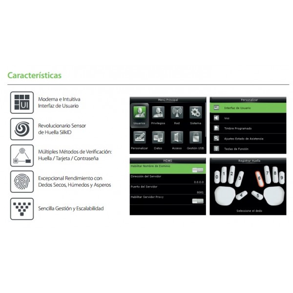 Revolucionario Sensor de Huella SilkIDMúltiples Métodos de Verificación:Huella / Tarjeta / ContraseñaExcepcional Rendimiento con Dedos Secos, Húmedos y AsperosSencilla Gestión y Escalabilidad